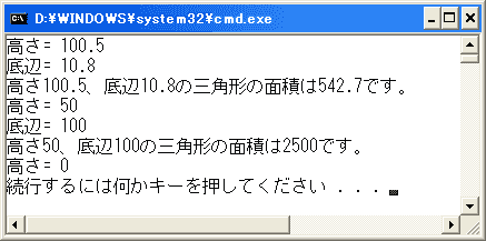 ここでは、while(true)なので、()内は常に真です。ユーザーが高さに0を入力すると break文でループを脱出します。C/C++を知っている人にはどうということもないものですが知らない人のために、後の章でC#の制御文について解説します。