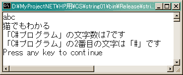 Console.WriteLine("「{0}」の2番目の文字は「{1}」です", strx, c);