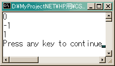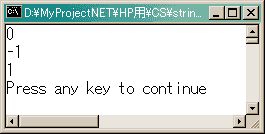 public int CompareTo( string strB );このオブジェクトとstrBとを比較します。同じなら0が返されます。このオブジェクトがstrBより小さい場合負の値が、大きいなら正の値が返されます。