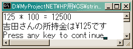str = string.Format("{0}さんの所持金は{1:c}です", name, i);