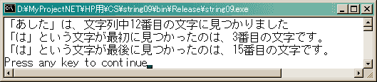 Console.WriteLine("「あした」は、文字列中{0}番目の文字に見つかりました",