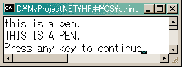 public string ToLower(); public string ToUpper();サンプルのプログラムを見てみましょう。