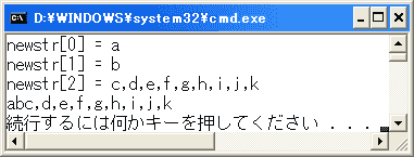 この例では、strを','で区切って部分文字列を取得していますが、その要素数を3に限定しています。