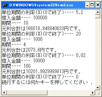 これは、利率と借入金と、期間を入力することにより、元利合計を求めるプログラムです。利率は複利で計算されます。