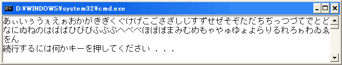 次は、ユニコードでいわゆる全角の「あ」から「ん」にある文字を全部表示するプログラムを作ってみましょう。
