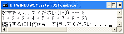 ...がただ一つの文であれば、{}は省略可能です。また、最後にセミコロン(;)がついていることに注意してください。次のプログラムでは1-9までの一桁の数字を入力してもらい(nとする)、1 + 2 +..+nの計算を行い、かつ計算式も表示するプログラムです。(単なるwhile文でも作れますが・・・)