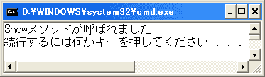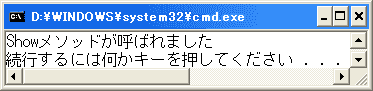 staticなメンバは、クラス名.メンバ名で呼び出せるので、MyClass.Show()で呼び出しを行っています。実行結果は次のようになります。