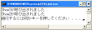Show2メソッドは、自分自身のクラスにいるので、単にShow2();で呼び出すことができます。もちろんmethod03.Show2();としてもかまいません。実行結果は次のようになります。