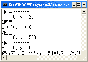 さて、次にmc3 = mc2;としています。これは、mc2の参照をmc3に代入しているのですね。 すると、mc3.Show();はmc2.Show();と同じことになります。第4回目の表示では、「x = 10, y = 0」となるはずです。