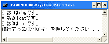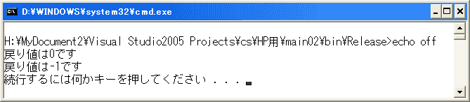 echo off "H:\MyDocument2\Visual Studio2005 Projects\cs\HP用\main02\bin\Release\main02.exe" a echo 戻り値は%errorlevel%です "H:\MyDocument2\Visual Studio2005 Projects\cs\HP用\main02\bin\Release\main02.exe" echo 戻り値は%errorlevel%です pause適当な名前(xxxx.bat)をつけて保存してください。パスの部分はご自分の環境に合わせて変えてください。このバッチをクリックすると、引数付きのmain02呼び出しと、引数無しの呼び出しが起ります。
