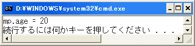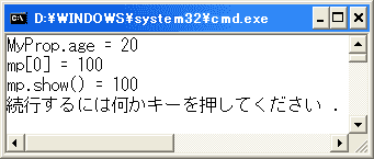 ageプロパティは関連するフィールドがありません。getアクセッサではいつも20を返しています(年齢がいつまでも20歳という意味です)。実行結果は次のようになります。
