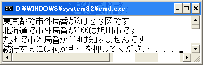 次の例は、インデックスにstring型とint型を使ったかなり変なプログラムです。 (なお、このプログラムの地名や市外局番は架空のものです)