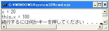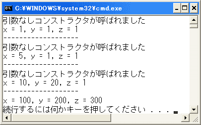 さて、引数を1つだけ持つバージョンでは MyClass(int a) : this()として、まず引数なしバージョンを呼んでx,y,zの値を全部1にしています。その後xの値をユーザーが指定したaに設定しています。