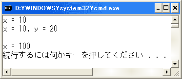 Console.WriteLine("x = {0}, y = {1}", x, y);