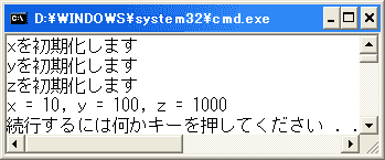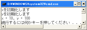 実行結果を見ると、基本クラスのコンストラクタから順番に実行されているのがわかります。もちろんMyClass2のコンストラクタでxを初期化することも可能ですが、非常にわかりにくいプログラムとなってしまいます。