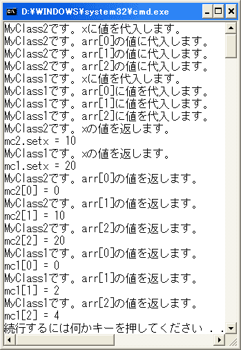 Mainメソッドでは、MyClass2のインスタンスを生成して、プロパティを通じて フィールドxに値を代入しています。インデクサにも値を代入しています。