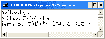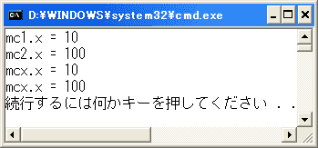 Main関数ではまず、MyClass1やMyClass2のインスタンスを生成して普通にxを利用して 値の代入をし、これを読み出しています。