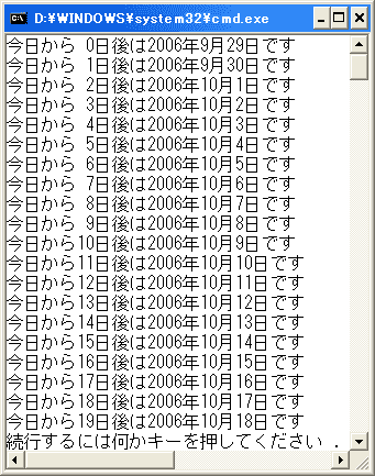 Console.WriteLine("今日から{0, 2}日後は{1}です", i, dtx.ToString("D"));