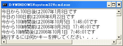 Console.WriteLine("今日から100日後は{0}です",