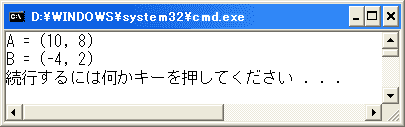 MyPosition mp = new MyPosition(3, 5); MyPosition np = new MyPosition(7, 3);のように、mpとnpというベクトルを生成しています。この2つのベクトルの 足し算、引き算をやっています。加算の結果は(3+7, 5+3)で(10,8)となります。 減算の結果は(3-7,5-3)で(-4,2)となります。
