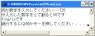 見てわかるように、「数字を入力してください」数字以外の文字を入力すると例外が発生します。言われたとおり、数字を入力するとその半分の値を出力します。