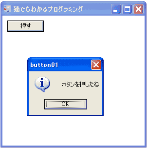 「押す」ボタンを押すと「ボタンを押したね」というメッセージボックスが出現します。