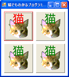 ここでは、100*100のボタンを4つ、(2列 * 2列, 各隙間を10)クライアント領域に表示する予定なので、クライアント領域のサイズは230*230にしています。その後、MyButtonクラスのインスタンスを4つ生成してControls.Addメソッドで、子供コントロールとして登録しています。