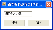 一つのボタンは、テキストボックスに表示されている文字列をメッセージボックスで表示します。もう一つのボタンは、テキストボックスをクリアします。
