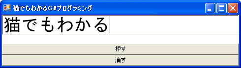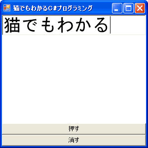 テキストボックスは上端に、2つのボタンは下端にドッキングします。「消す」ボタンの方が後から、設定しているので一番下端が「消す」ボタン、その上に「押す」ボタンが来るはずです。