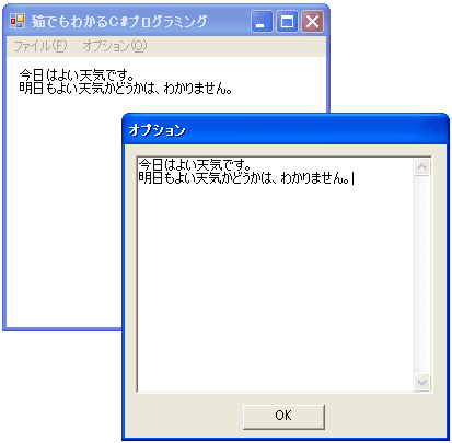 前章のプログラムでは、ダイアログボックスのテキストボックスに入力した内容は、ダイアログを閉じたときに、親フォームに反映されました。