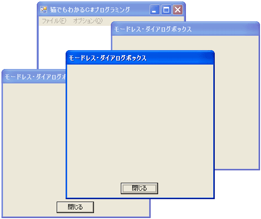ダイアログボックスが表示されている状態でも、親フォームのメニューを操作できるので、多数のモードレス・ダイアログボックスを表示することができます。