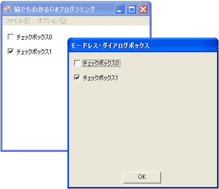この章では、オーナーのフォームとモードレス・ダイアログボックスに同じチェックボックスを持ち、どちらかのチェック内容が変更になったら、他方にそれが反映されるようにします。