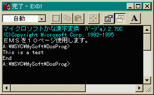 左の図のようにDOS窓が開いて、「This is a test」
