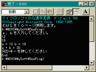 「a = 12 b = 18」「a + b = 30」「何かキーを押してください」