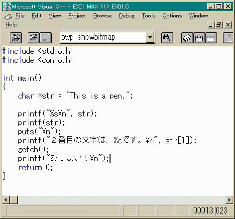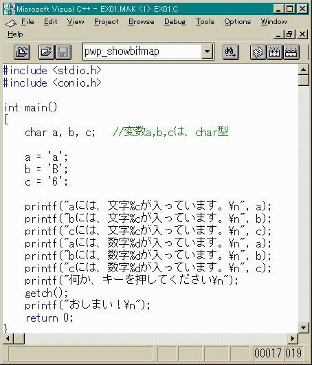 それを、printfで確かめます。文字型を表す書式