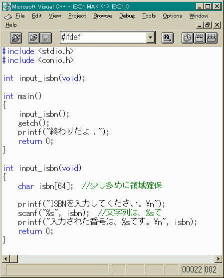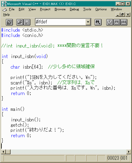 int input_isbn(void);と、関数の宣言をしていることに注意してください。自分で 作る関数は、最初に宣言することになっています。 これを、「関数のプロトタイプ宣言」などと言います。 関数の戻り値は、int型で、引数はなしと言う意味です。こんな面倒な ことはできん!と言う方には、別な書き方もあります。(後述)