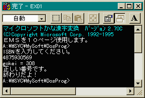 #include <stdio.h> #include <string.h> #include <conio.h>//どうしてinclude文が増えたか //考えてみてください。 int input_isbn(void); int check_isbn(char *); //今回作成した関数 int main() { input_isbn(); getch(); printf("終わりだよ!"); return 0; } int input_isbn(void) { char isbn[64]; int ret; printf("ISBNを入力してください。\n"); scanf("%s", isbn); //文字列は、%sで ret = check_isbn(isbn); switch (ret) { case -2:printf("入力ミスです\n"); break; case -1:printf("不正番号です\n"); break; case 0:printf("正しい番号です。\n"); break; } return 0; } int check_isbn(char *bango) //intをかえす関数です //これを呼んだ側の関数で //返されたintを使っています。 { int gokei, suuchi[10], i; if (strlen(bango) != 10) //文字列の長さチェック return -2; //10文字でなければ-2をかえす gokei = 0; //合計用変数の初期化 for (i = 0; i <= 8; i++) { suuchi[i] = bango[i] - 48; //これがミソ!!!! } for (i = 0; i <= 8; i++) gokei = gokei + suuchi[i] * (10-i); //最後がXのこともあるのだよ! if (bango[9] == 'X' || bango[9] == 'x') gokei = gokei + 10; else gokei = gokei + bango[9] - 48; printf("gokei = %d\n", gokei); if (gokei % 11 == 0) //合計が11の倍数なら0 return 0; else return -1; //そうでなければ−1をかえす }