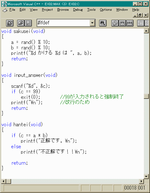 という形式は、すでにご存知と思います。else以下は 無くてもかまいません。実行内容が、1つの文だけであれば カッコで囲まなくてもOKです。 では、適当なかけ算(九九)を出題して、ユーザーに 答えを入力させて、あっているかどうかを判定する プログラムを考えてみましょう。if(条件式) { 条件式が正しい(真)時の実行内容; }else { 条件式が正しくない(偽)時実行する内容; }