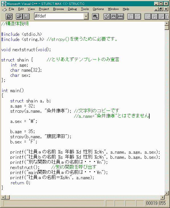 これは、社員(shain)構造体をフルに宣言した物です。社員a,b,cについて、 年齢、名前、性別を格納することができます。たとえば、社員aの年齢は、 a.ageで表すことができます。このばあい、shainを 構造体テンプレート(template)と呼ぶことがあります。 要するに、鋳型です。鋳型を元に あとからいくらでも同じ形の物を製造できるからです。struct shain { int age; char name[32]; char sex; }a, b, c;