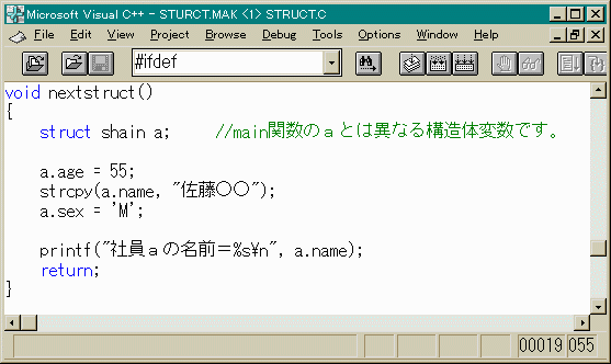 宣言する場所に気をつけてください。関数内で宣言すればその中で しか参照することができません。たとえば、テンプレートを グローバルの位置に、構造体変数を関数内で宣言すると、この構造体 変数は、その関数内でしか参照できません。別な関数で同じ名前の 構造体変数を宣言しても、それらは別の変数となります。これは、 一般の変数と同じです。(この意味の分からない方は、次の例を よく見てください。)//関数外に宣言 struct shain{ int age; char name[32]; char sex; }; main() { ...... sturct shain a, b, c, d;//int x, y, z;というような感じで宣言 ..... }