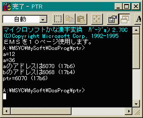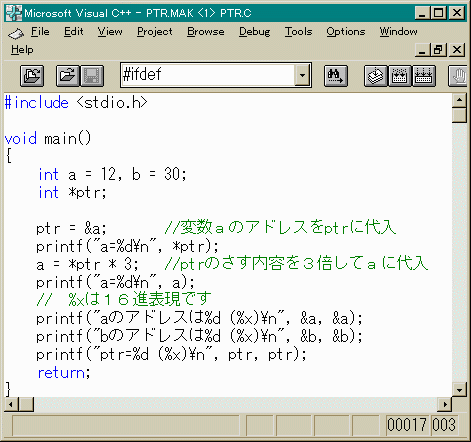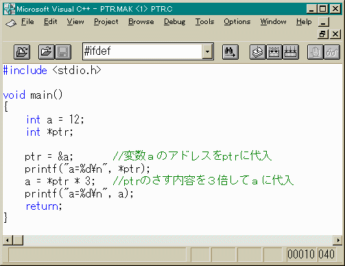 とすれば、ptrがポインタとなります。ptrはどのように 宣言するかというとptr = &a;