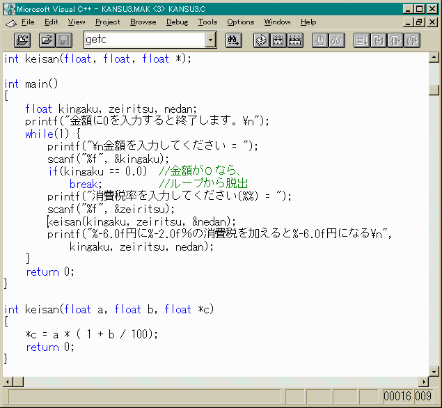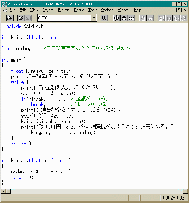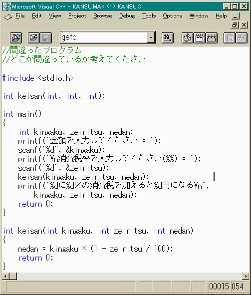 などの対策が考えられます。ほかにもいろいろ対策はあるでしょう。 まずは、(1)の対策を講じてみましょう。これは簡単ですね。 それと、int型の数値をint型の数値でわり算すると 必ずしもint型にならないですね。(1)宣言しただけの変数nedanをkeisanに渡したのがいけない。 これを渡さず、関数の戻り値として計算結果をもらう。 (2)nedanのアドレスをkeisanに渡す (3)nedanをどこからでも見えるようにしておく。(グローバル変数)