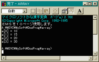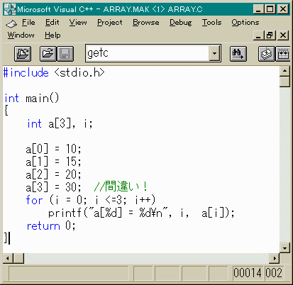 と宣言するとint型の変数a[0], a[1], a[2]を宣言したことになります。 これらは、「要素(element)」と呼ばれます。 []の中は、0から始まっていることに注意してください。 上のように宣言した場合a[3]は存在しません。int a[3];