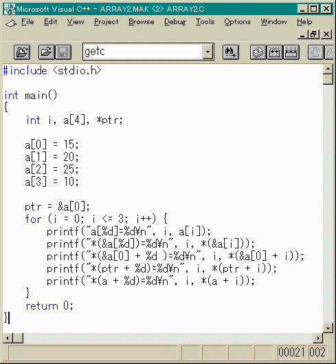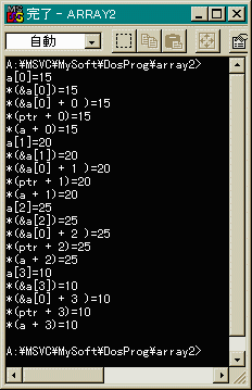 どうです。この位例を出せば何となくわかってきたのではないでしょうか。 実際に、本当にそうなのかプログラムを作ってみましょう。&a[0] + 2 は a[2]のアドレスすなわち &a[2]と同じ(104番地) *(&a[0] + 2) は a[2]の内容すなわち 25 ptr + 2 は a[2]のアドレスすなわち &a[2]と同じ *(ptr + 2)は a[2]の内容すなわち 25 &a[0] は a[0] のアドレスで この値は、ptr に代入されている a は a[0]のアドレスを表すのでptrと同じ