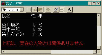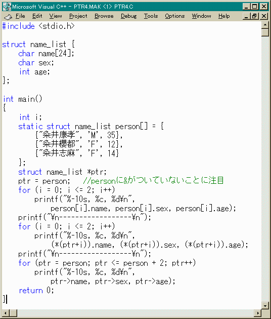 #include <stdio.h> #define text_set(x, y) (printf("\x1b[%d;%dH", y, x)) //カーソル位置 #define clear_txt() printf("\x1b[2J") //画面消去 #define red_color() printf("\x1b[31m") //赤色に #define white_color() printf("\x1b[37m") //白色に struct name_list {//構造体テンプレート  char name[14]; char sex; int age; }; int main() { int i; static struct name_list member[] = { //構造体変数が配列 {"粂井康孝", 'M', 32}, //このような配列の初期化は {"田中一郎", 'M', 38}, //staticで {"粂井ひとみ", 'F', 36} }; clear_txt(); //マクロです printf("%-12s %2s %2s\n", "氏名", "性", "年"); for(i = 0; i <= 19; i++) putchar('-'); for(i = 0; i <= 2; i++) { text_set(1, i + 3); printf("%-12s %2c %2d", member[i].name, member[i].sex, member[i].age); } red_color(); printf("\n\n上記は、実在の人物とは関係ありません\n"); white_color(); return 0; }