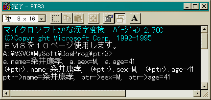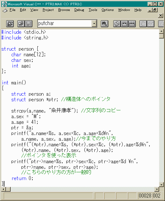 さて、今度は本題の構造体へのポインタをやります。 これも、今までの知識から類推できると思いますが 念のため例題を示して解説します。