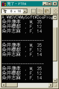 第26章で予告したとおり、構造体へのポインタをやります。 その前に、構造体変数が配列になっている場合の例を示します。 これは、よく使います。是非使い方をマスターしてください。
