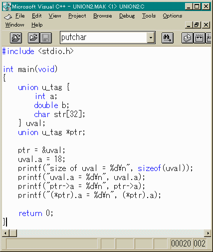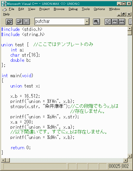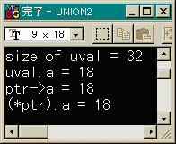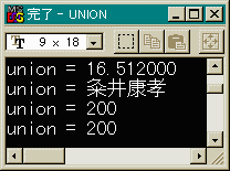 のように宣言します。最後のunion_vが共用体変数となります。 a, str, bなどは共用体メンバといいます。 使い方は、構造体と同じです。ただし、格納できるのは1回に どれかのメンバのみです。次に別のメンバを使うと最初のは 消えて無くなります。十分注意して使いましょう。従って、 宣言時に初期化することはできません。 下に、共用体の間違った使い方の例を示します。union union_tag { int a; char *str; float b; } union_v;