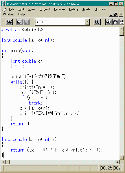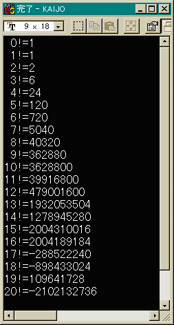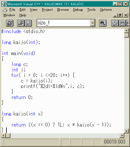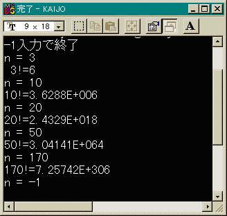 という意味です。また0!=1です。(そんなの知ってらあ!) では、早速プログラムを書いてみましょう。n! = n * (n-1) * (n-2)*....3 * 2 * 1