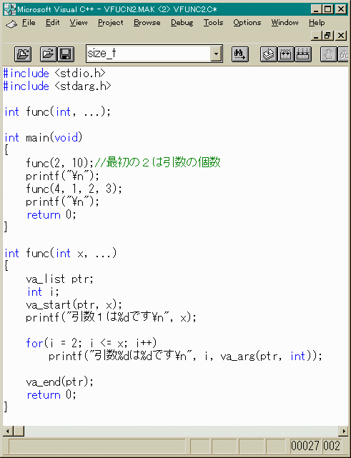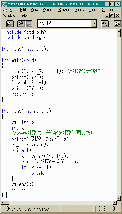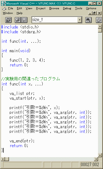どうです。意味は分からないとしても作り方はわかったような気になるでしょう。 では、実際にどんなふうになるか実験のプログラムを書いてみましょう。 これは、実験のためのプログラムで実際は間違ったプログラムです。手順 0.#include <stdarg.h>これをインクルード 1.可変個の引数を取る関数を int func(x, ...); のように書く。...の所は、実際にピリオドを3つ書く。 関数の戻り値は任意でよい。もちろん関数名も何でもよい。 上の例の場合、xを必須の引数...をオプション引数という。 2.この関数の中に、 va_list型の変数を1つ宣言する。 たとえば、 va_list ptr; のように。 3.va_start(ptr, x);と va_end(ptr);でサンドイッチされた所で オプション引数を取得する これにはva_arg(ptr, 引数の型名); を使う。 これが呼ばれるごとに自動的にポインタが進み 次々に引数を取得できる